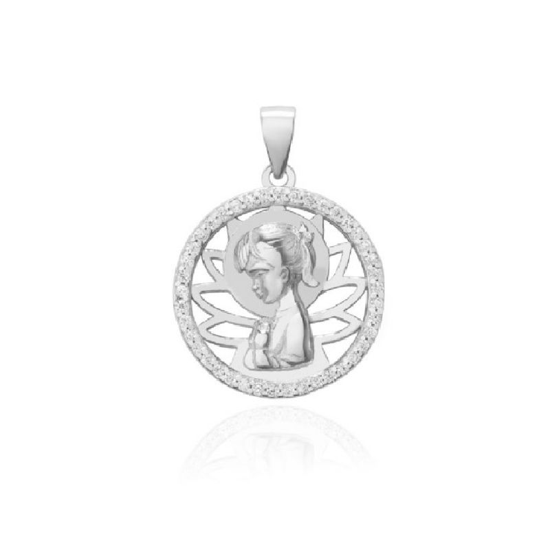 Colgante en plata de la Virgen Niña y circonitas blancas alrededor. Tamaño 1,8cm