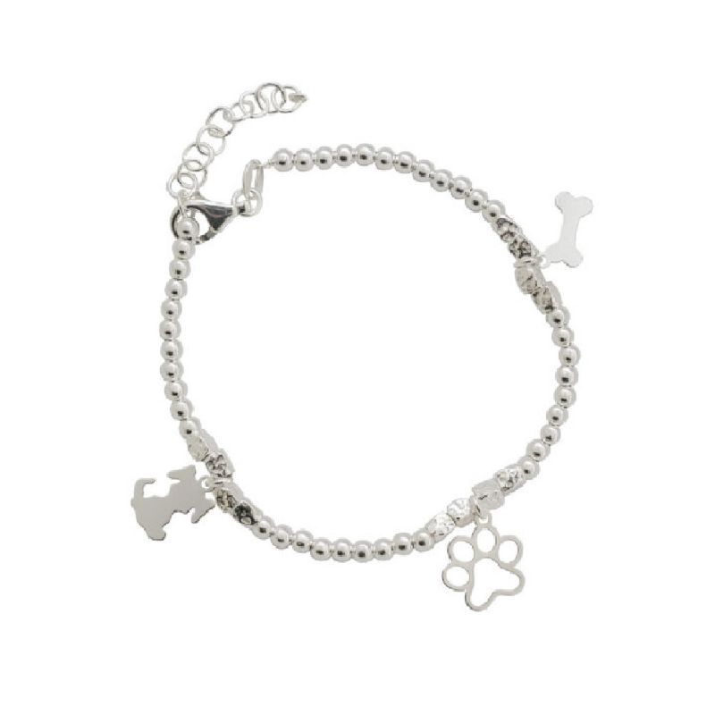 Pulsera de Plata de Bolitas con la silueta de un Perrito, Huella y Hueso.