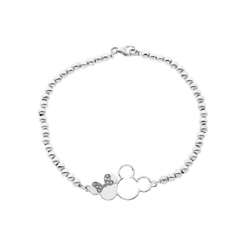 Pulsera de plata con pulsera de bolitas con la union de Minie y Mikie en el centro. Largo 16-19cm