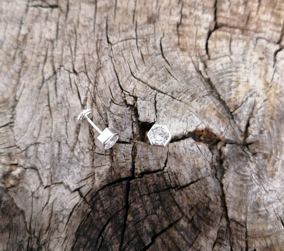 Pendientes con tornillería de rosca formando hexágono en plata lisa con circonita blanca en el centro